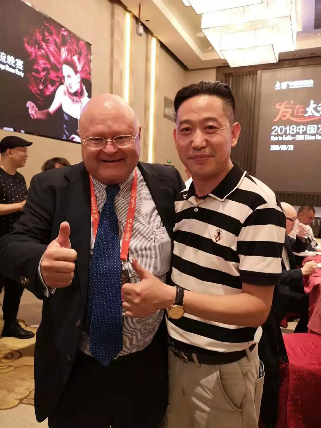 武漢天姿企業(yè)董事長雷三林先生(左一)應(yīng)邀出席2018年中國發(fā)博會。與行業(yè)名流合影,美業(yè)制造器材的元老超霸企業(yè)的董事長陳國強(中),ICD世界發(fā)型師協(xié)會中國區(qū)會長樂嘉放(右)。